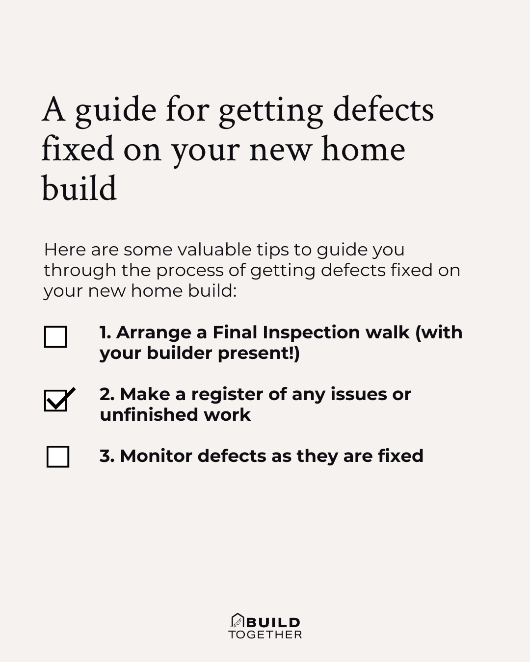 Here are some valuable tips to guide you through the process of getting defects fixed on your new home build